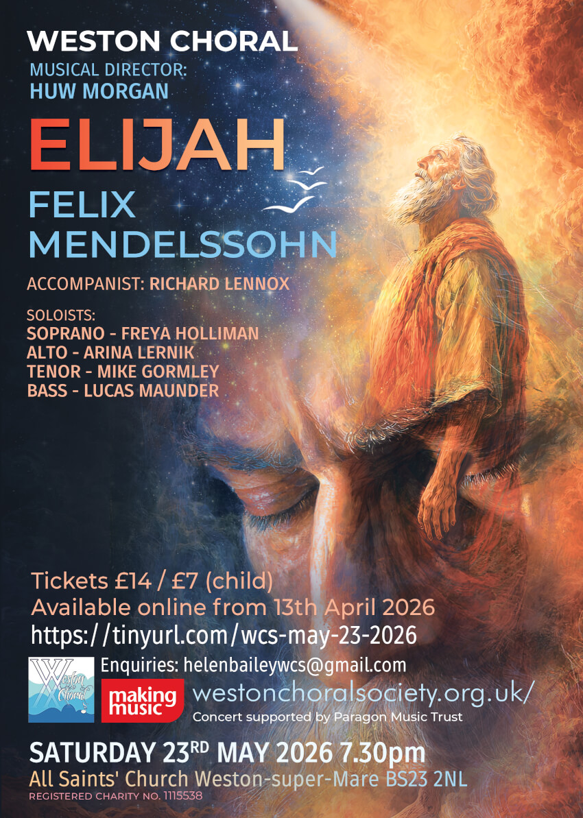 Weston Choral is delighted to announce its forthcoming Summer Concert, to be held at All Saints Church, Weston-super-Mare on Saturday 23 May 2026 at 7.30pm. This special evening will feature a performance of Felix Mendelssohn’s dramatic oratorio Elijah, sung in English.
